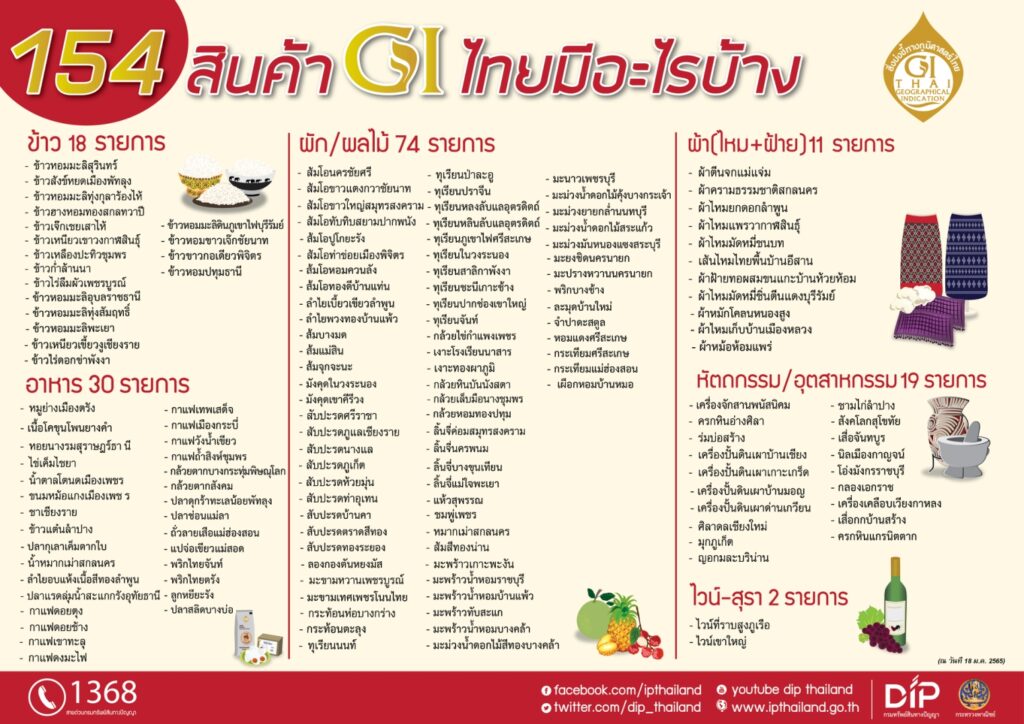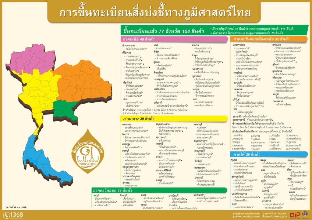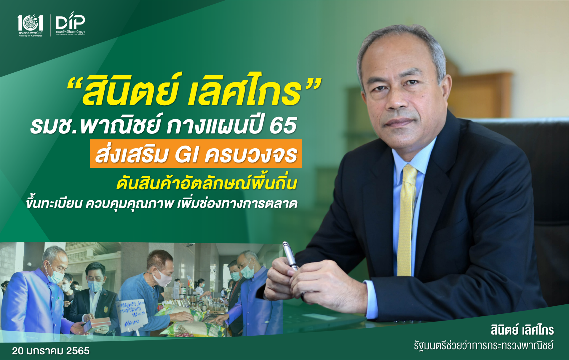 นายสินิตย์ เลิศไกร รัฐมนตรีช่วยว่าการกระทรวงพาณิชย์ เปิดเผยว่า รัฐบาลให้ความสำคัญกับการขับเคลื่อนเศรษฐกิจฐานราก และกระทรวงพาณิชย์ได้ขานรับนโยบายดังกล่าว โดยการส่งเสริมการคุ้มครองสิ่งบ่งชี้ทางภูมิศาสตร์ (GI) ไทยอย่างครบวงจร ซึ่งเป็นภารกิจสำคัญของกรมทรัพย์สินทางปัญญา เริ่มตั้งแต่การส่งเสริมการขึ้นทะเบียนสินค้า GI ไทยทั่วทุกภูมิภาค การจัดทำระบบควบคุมคุณภาพสินค้าเพื่อสร้างความมั่นใจให้กับผู้บริโภคทั้งในประเทศและต่างประเทศ และการส่งเสริมการตลาดทั้งออฟไลน์และออนไลน์ โดยในปี 2564 ที่ผ่านมา ได้ดำเนินการเห็นผลเป็นรูปธรรม สามารถขึ้นทะเบียนสินค้า GI ไทยเพิ่มอีก 18 รายการ รวมเป็น 152 รายการ สร้างมูลค่าเพิ่มรวมกว่า 39,000 ล้านบาท ความสำเร็จดังกล่าวเป็นกลไกสำคัญในการช่วยยกระดับและสร้างมูลค่าเพิ่มให้กับสินค้าชุมชน ช่วยผู้ประกอบการและเกษตรกรรายย่อยไม่ถูกกดราคา สร้างกระบวนการผลิตสินค้าอัตลักษณ์พื้นที่ของไทยให้เป็นไปตามมาตรฐาน และทำให้ผู้บริโภคเกิดความมั่นใจในคุณภาพของสินค้า GI ไทย สร้างงาน สร้างรายได้ และสร้างความเข้มแข็งให้กับท้องถิ่นชุมชนอย่างยั่งยืน