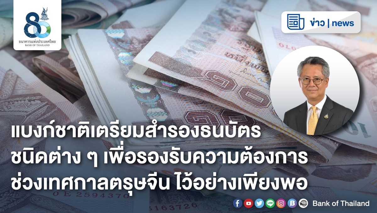 นายสมบูรณ์ จิตเป็นธม ผู้ช่วยผู้ว่าการ สายออกบัตรธนาคาร ธนาคารแห่งประเทศไทย (ธปท.) เปิดเผยว่า ในช่วงเทศกาลตรุษจีนปี 2565 ที่ความต้องการใช้ธนบัตรของประชาชนจะเพิ่มขึ้นสูงกว่าปกติ ธปท.ได้พิจารณาปัจจัยทางเศรษฐกิจ สถานการณ์โควิด-19 มาตรการภาครัฐที่เกี่ยวข้อง รวมทั้งแนวโน้มการชำระเงินผ่านช่องทางต่างๆ แล้ว ประมาณการว่า ในช่วง 2 สัปดาห์ก่อนเทศกาลตรุษจีน น่าจะมีการเบิกจ่ายธนบัตรเพิ่มขึ้นกว่าปกติ ประมาณ 27,000 ล้านบาท แต่เทียบกับเทศกาลตรุษจีนปีก่อน จะลดลงประมาณร้อยละ 3 ทั้งนี้ ธปท.ได้เตรียมสำรองธนบัตรชนิดราคาต่างๆ ไว้อย่างเพียงพอ เพื่อรองรับความต้องการของประชาชนเรียบร้อยแล้ว