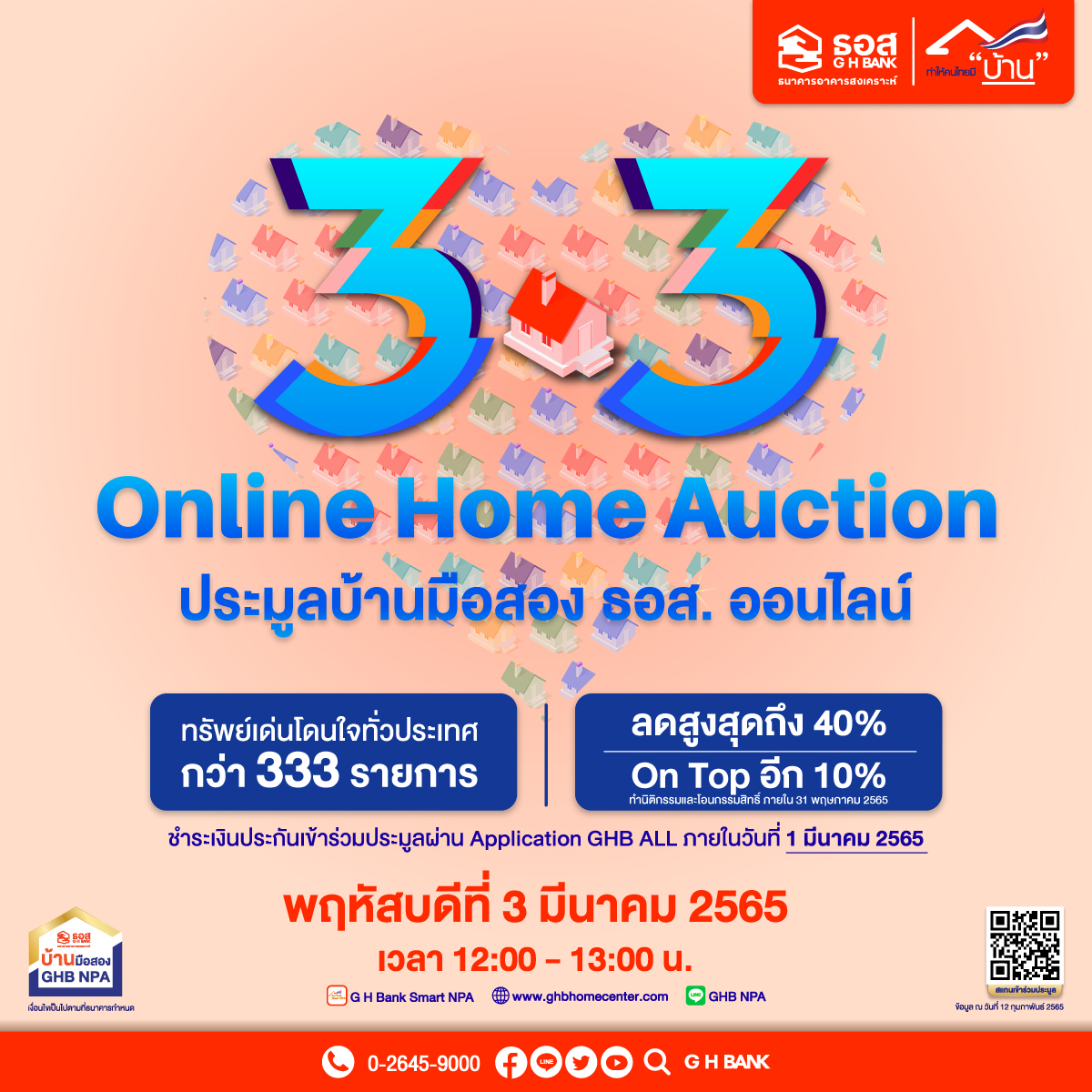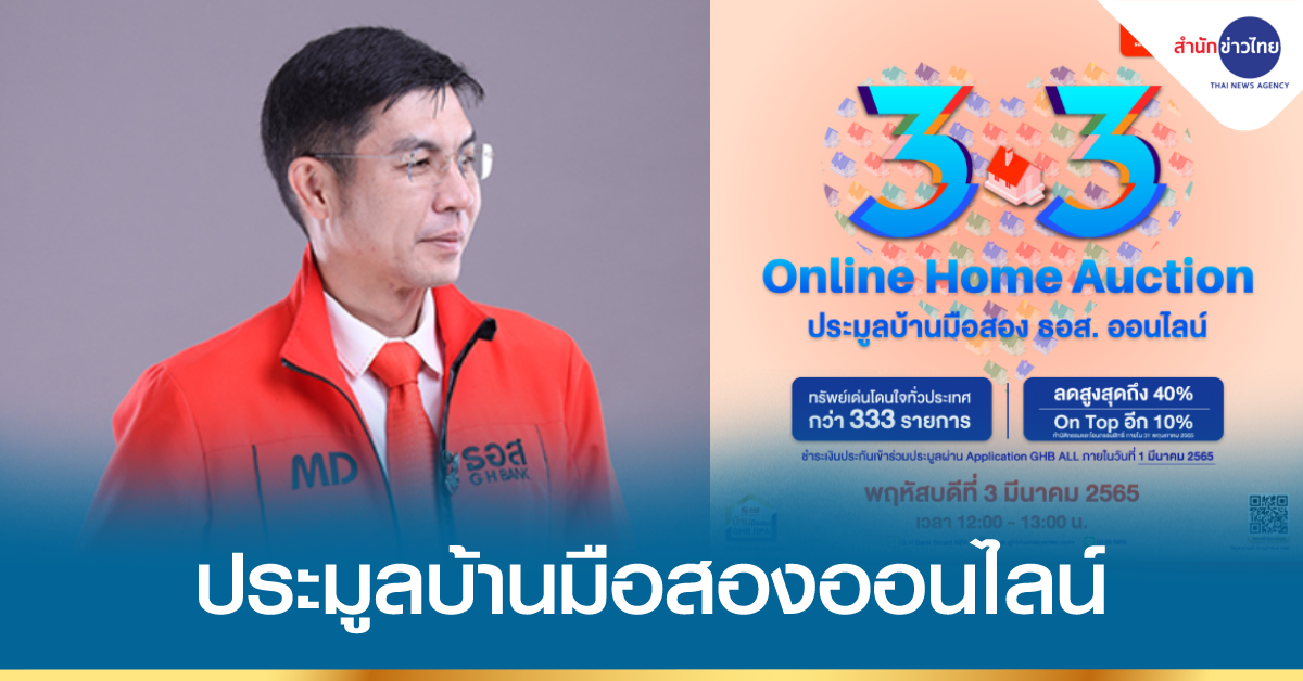 กรุงเทพฯ 28 ก.พ. – ธอส.เปิดประมูลบ้านมือสอง ธอส. ผ่าน Application : G H Bank Smart NPA ขนทรัพย์เด่น 333 รายการ ราคาพิเศษ รับส่วนลดสูงสุดถึง 40%