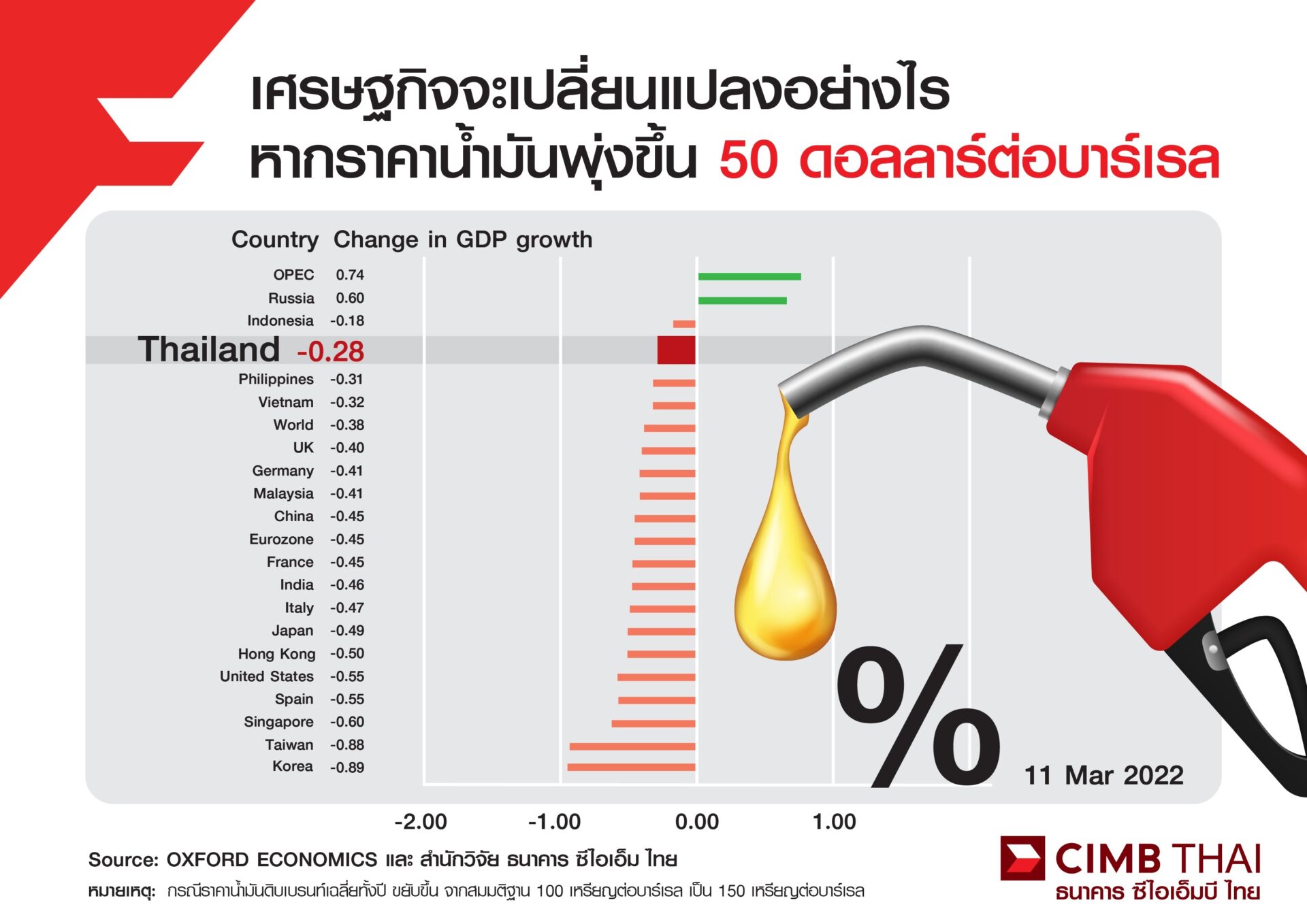 ทางสำนักวิจัยได้ใช้แบบจำลองจาก Oxford Economics (ภาพประกอบ) เปรียบเทียบผลกระทบทางเศรษฐกิจ (GDP) ในแต่ละประเทศ บนสมมติฐาน กรณีราคาน้ำมันดิบเบรนท์เฉลี่ยทั้งปี ขยับขึ้น 50 เหรียญต่อบาร์เรล จากสมมติฐาน 100 เหรียญต่อบาร์เรล ไปที่ 150 เหรียญต่อบาร์เรล จะส่งผลต่อการเปลี่ยนแปลง GDP อย่างไรเมื่อเทียบกับกรณีฐานประเทศที่ได้ประโยชน์จากราคาน้ำมันสูงขึ้น คือ รัสเซีย และประเทศกลุ่ม OPEC ซึ่งเป็นผู้ส่งออกน้ำมัน ขณะที่ประเทศที่ใช้น้ำมันมากๆ อาทิ ไทย อินเดีย ประเทศในอาเซียน สหรัฐอเมริกา เกาหลีใต้ และอีกหลายประเทศ จะมีเศรษฐกิจที่ชะลอกว่าคาด นั่นคือ ชะลอกว่ากรณีฐานที่ราคาน้ำมัน 100 เหรียญต่อบาร์เรล แปลว่า ถ้าราคาน้ำมัน 150 เหรียญต่อบาร์เรล เศรษฐกิจจะขยายตัวอยู่ เพียงแต่จะขยายตัวช้าลงกว่ากรณีฐาน เช่น ไทย อาจจะชะลอได้ 0.3% จากกรณีฐาน