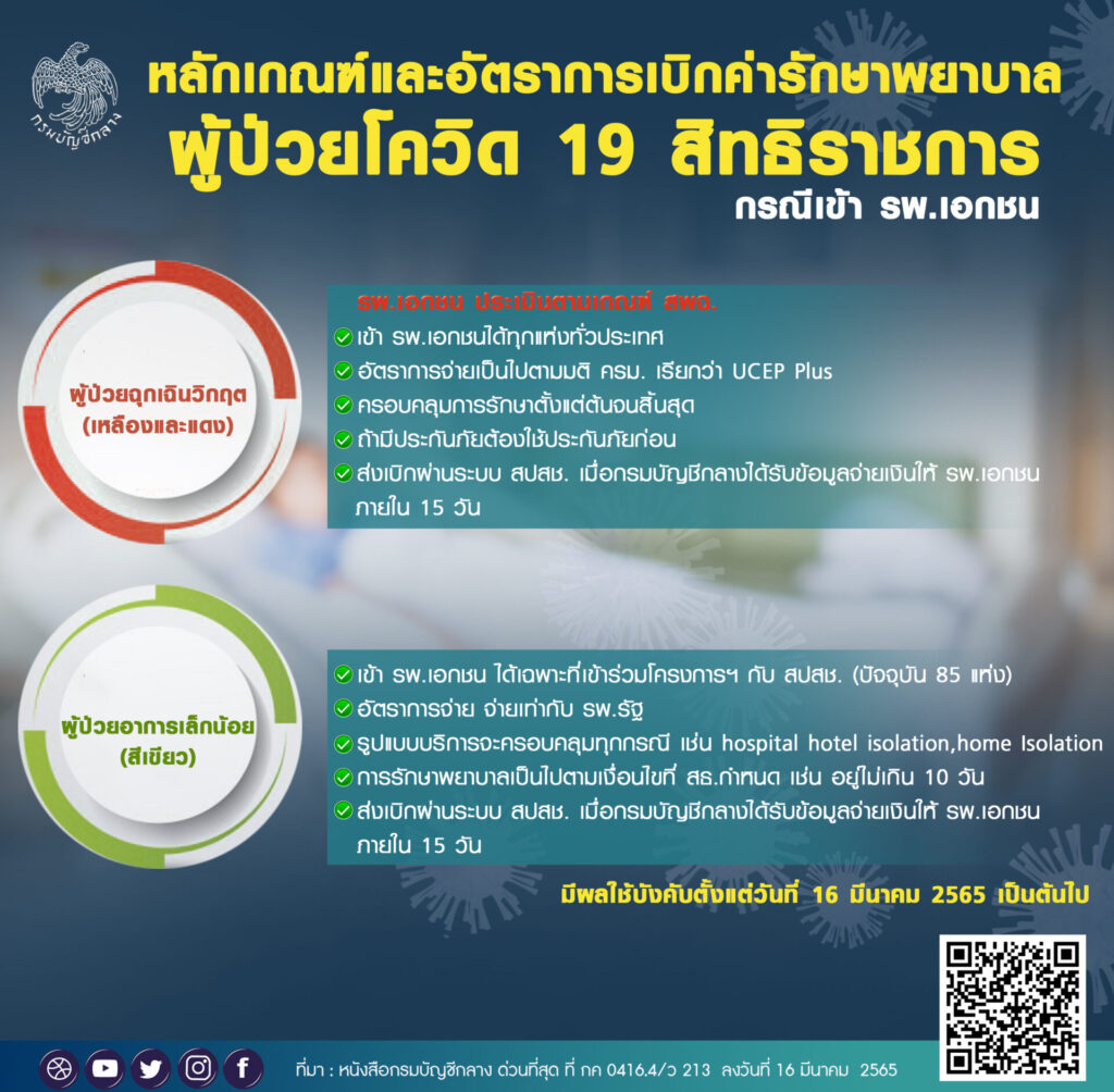 นางสาวกุลยา ตันติเตมิท อธิบดีกรมบัญชีกลาง เปิดเผยว่า ด้วยคณะรัฐมนตรีมีมติเห็นชอบหลักเกณฑ์ วิธีการ และเงื่อนไขการกำหนดค่าใช้จ่ายในการดำเนินการผู้ป่วยฉุกเฉินวิกฤต กรณีโรคติดเชื้อไวรัสโคโรนา 2019 หรือโรคโควิด 19 (Coronavirus Disease 2019 (COVID – 19) กรณีติดเชื้อโรคโควิด 19 ที่แพทย์วินิจฉัยว่าเข้าเกณฑ์วิกฤตฉุกเฉิน (UCEP Plus) ตามเกณฑ์ที่สถาบันการแพทย์ฉุกเฉินแห่งชาติ (สพฉ.) ได้กำหนดแนวทางและเกณฑ์ประเมินคัดแยกระดับความฉุกเฉิน ใช้ระดับความรุนแรงของผู้ป่วย (สีแดง สีเหลือง และสีเขียว) เป็นเกณฑ์ในการพิจารณาให้เข้ารับการรักษาพยาบาลในสถานพยาบาลของเอกชน โดยให้มีผลใช้บังคับตั้งแต่วันที่ 16 มีนาคม 2565 ดังนั้น เพื่อมิให้เกิดความเหลื่อมล้ำในระบบสุขภาพ อีกทั้งสอดคล้องกับแนวทางที่ สพฉ.กำหนด กรมบัญชีกลางจึงยกเลิกหนังสือกรมบัญชีกลาง ด่วนที่สุด ที่ กค 0416.4/ว 273 ลงวันที่ 18 มิถุนายน 2563 และกำหนดหลักเกณฑ์และอัตราการเบิกเงินค่ารักษาพยาบาลสถานพยาบาลของเอกชน กรณีผู้มีสิทธิหรือบุคคลในครอบครัวติดเชื้อไวรัสโคโรนา 2019 หรือโรคโควิด 19 โดยมีสาระสำคัญ ดังนี้
