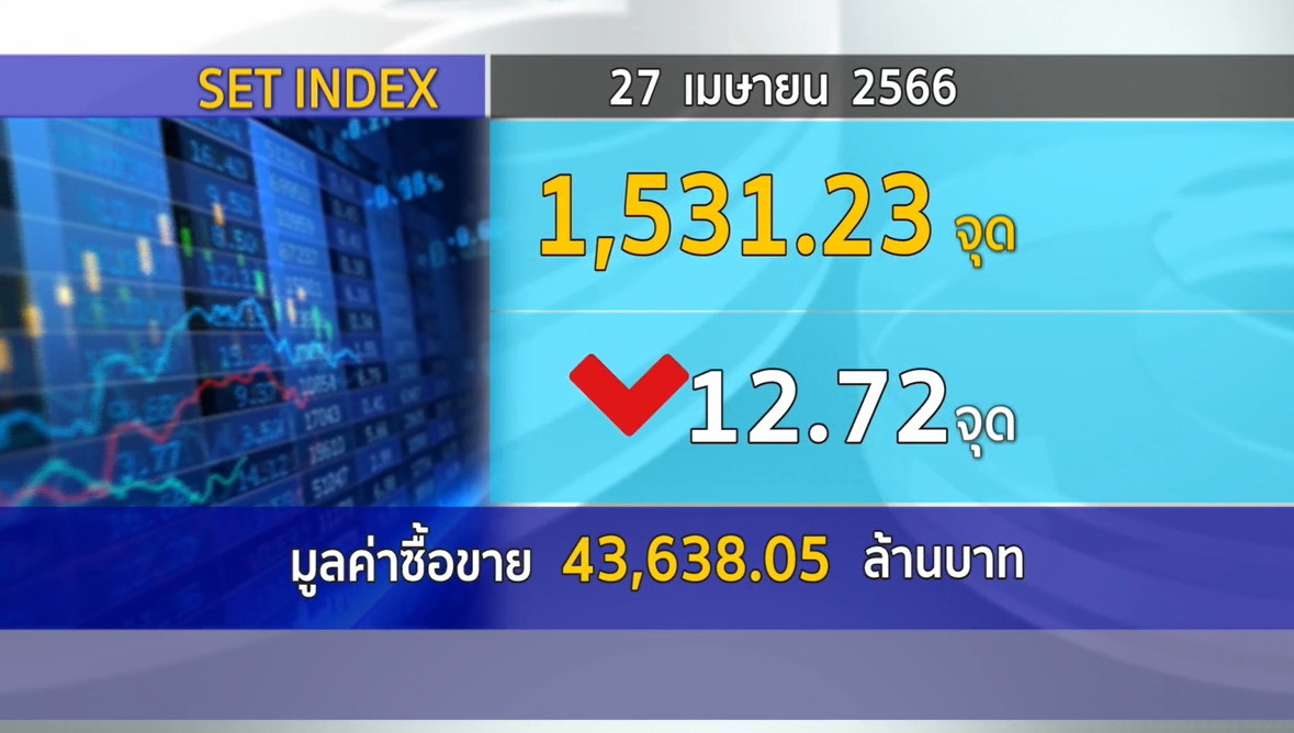 กทม. 27 เม.ย.-SET ปิดวันนี้ที่ 1,531.23 จุด ลดลง 12.72 จุด (-0.82%) มูลค่าการซื้อขาย 43,638.05 ล้านบาท