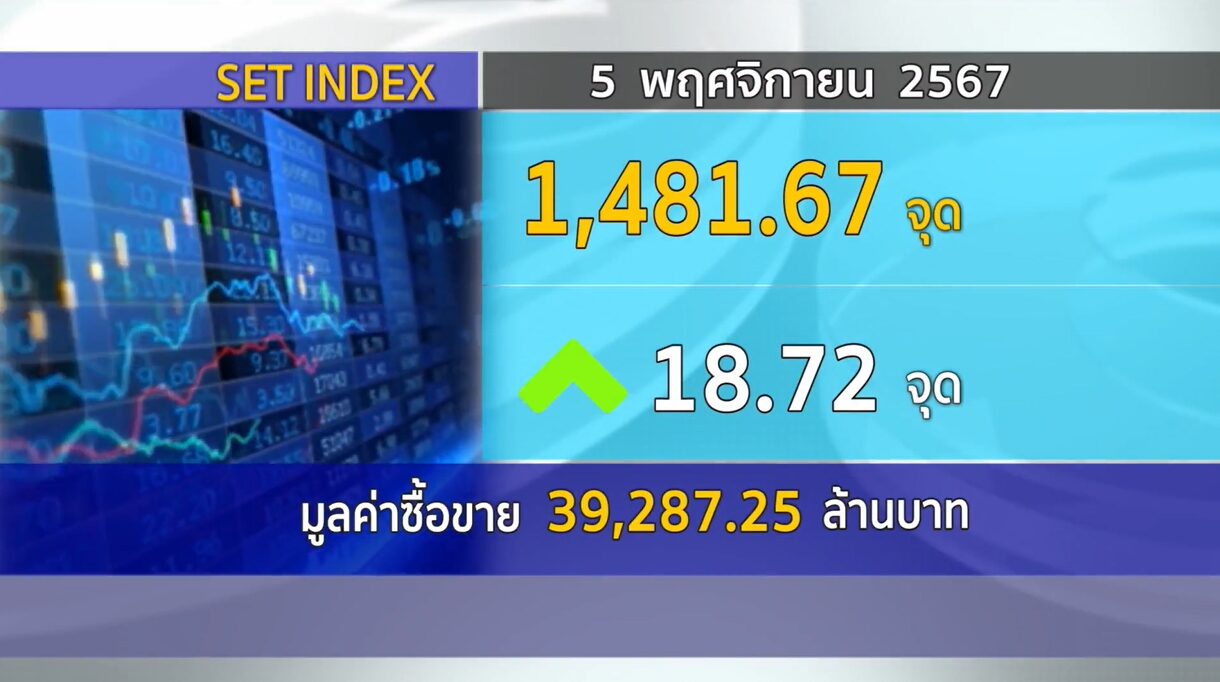 กทม. 5 พ.ย.-SET ปิดวันนี้ที่ 1,481.67 จุด เพิ่มขึ้น 18.72 จุด (+1.28%) มูลค่าซื้อขายราว 39,319.46 ล้านบาท