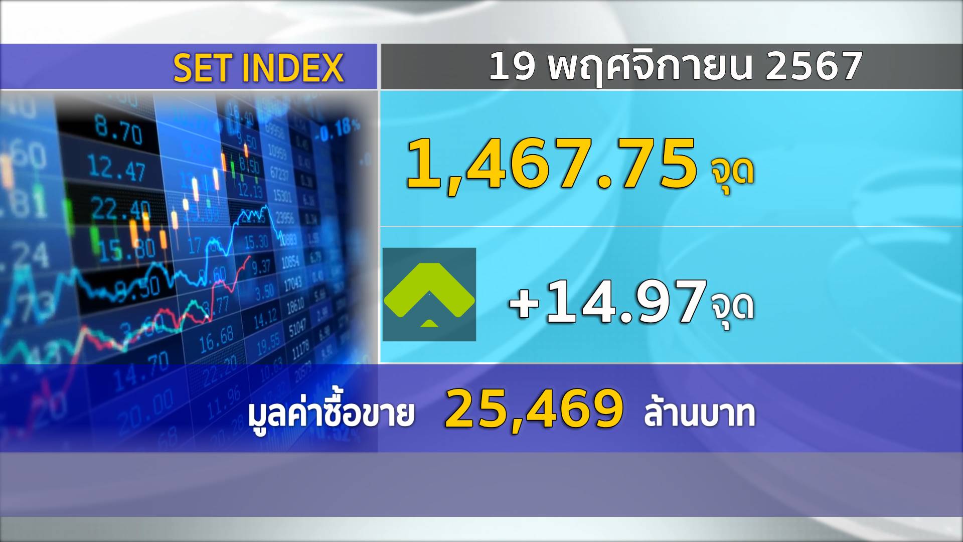 กทม. 19 พ.ย.-ตลาดหลักทรัพย์ฯ ปิดภาคเช้าที่ 1,467.75 จุด เพิ่มขึ้น 14.97 จุด (+1.03%) มูลค่าซื้อขายราว 25,469 ล้านบาท