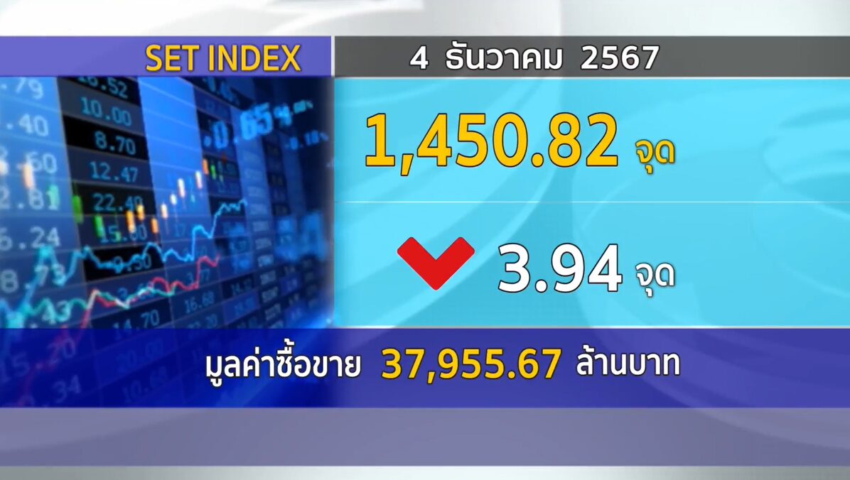 กทม. 4 ธ.ค.-SET ปิดวันนี้ที่ 1,450.82 จุด ลดลง 3.94 จุด (-0.27%) มูลค่าการซื้อขาย 37,955.67 ล้านบาท