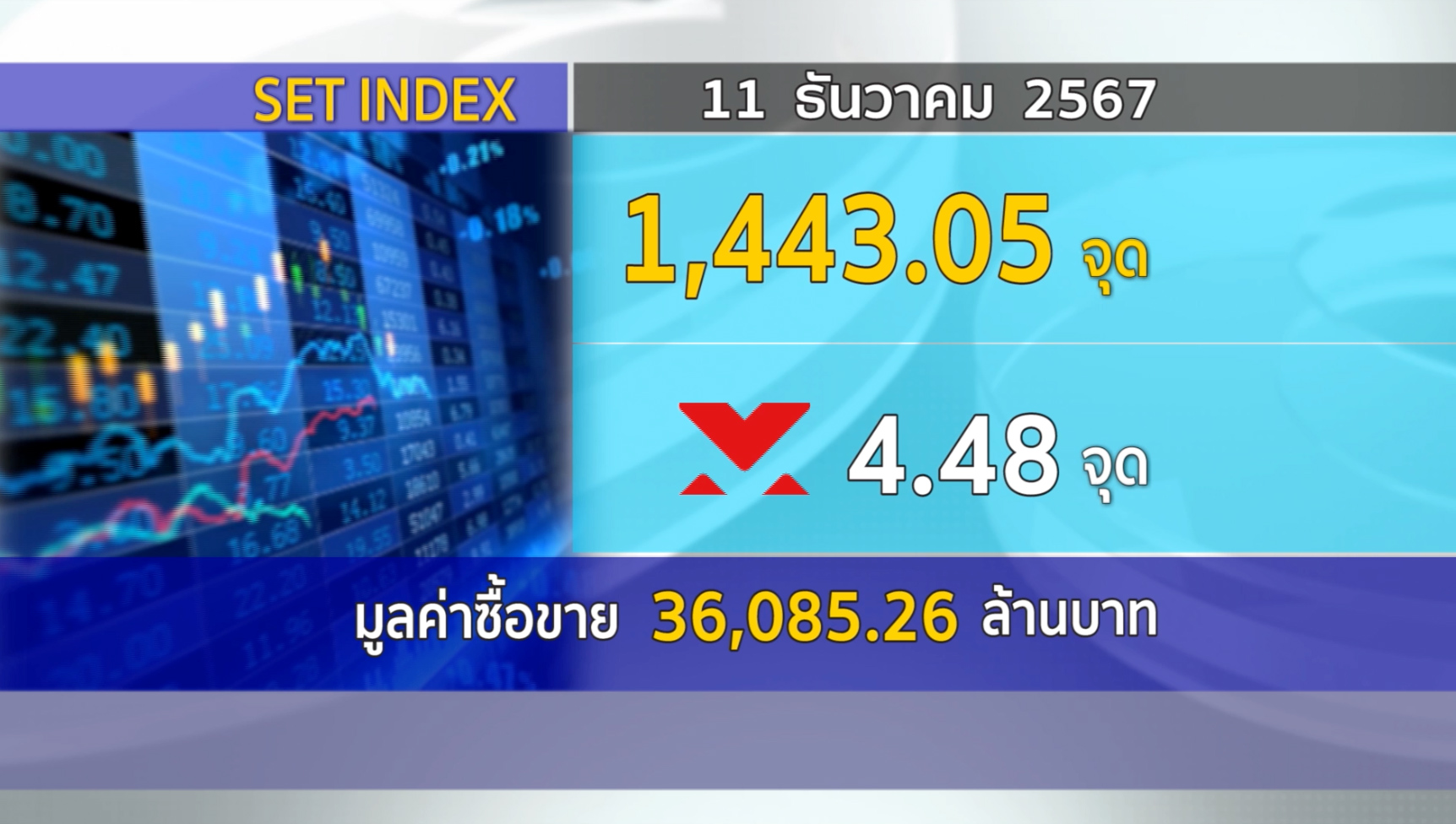 กทม. 11 ธ.ค.- SET ปิดวันนี้ที่ 1,443.05 จุด ลดลง 4.48 จุด(-0.31%) มูลค่าซื้อขาย 36,085.21 ล้านบาท