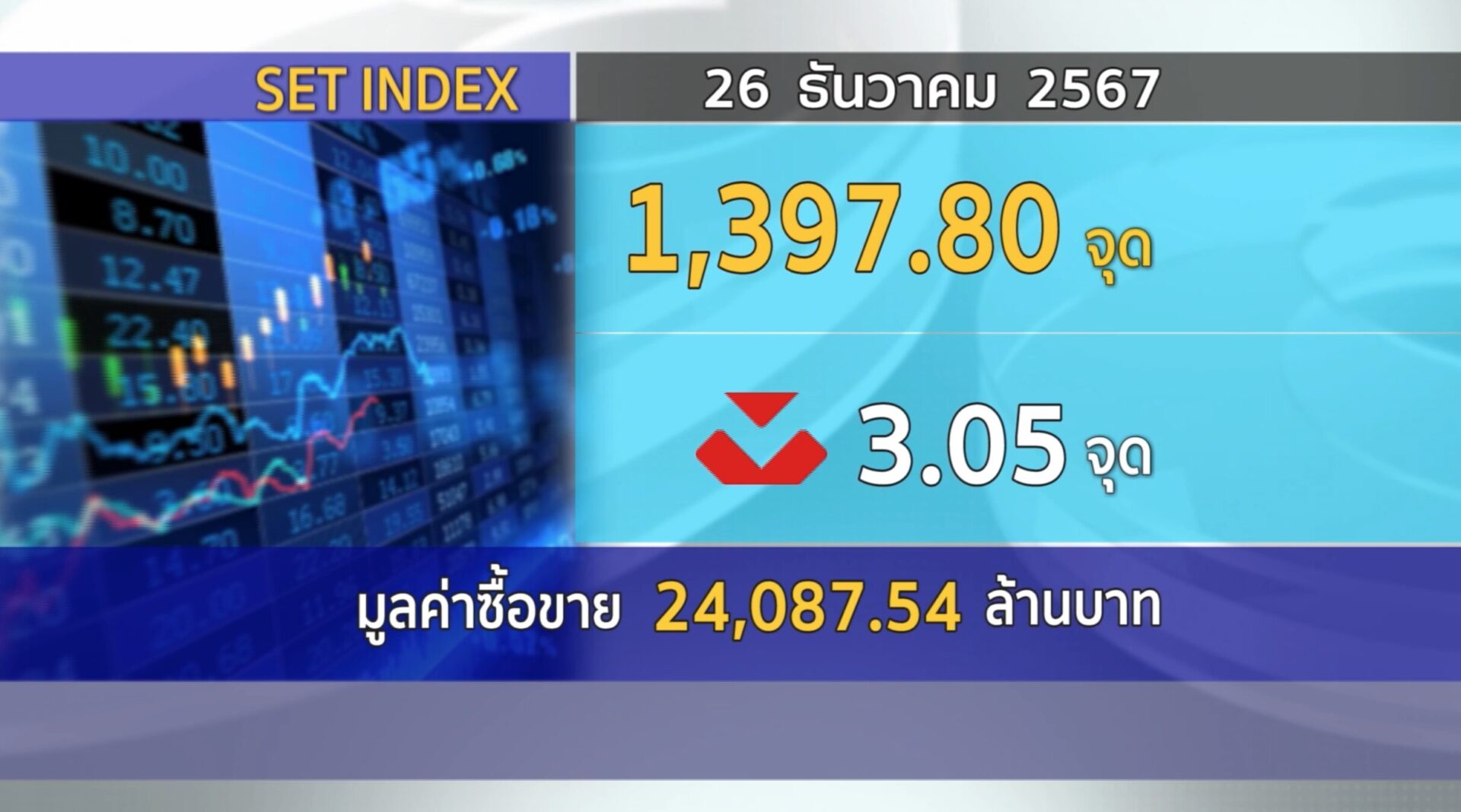 กทม. 26 ธ.ค.- ตลาดหุ้นไทยปิดวันนี้ที่ 1,397.80 จุด ลดลง 3.05 จุด (-0.22%) มูลค่าการซื้อขาย 24,087.54 ล้านบาท