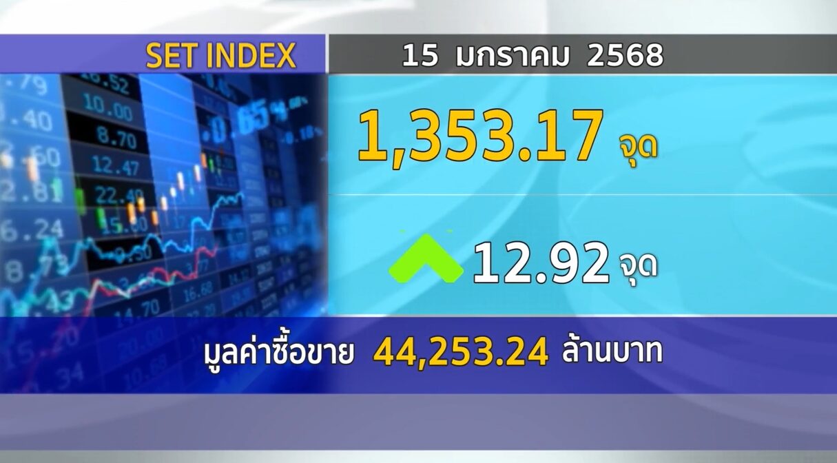 กทม. 15 ม.ค.-SET ปิดวันนี้ที่ 1,353.17 จุด เพิ่มขึ้น 12.92 จุด (+0.96%) มูลค่าซื้อขาย 44,216.57 ล้านบาท