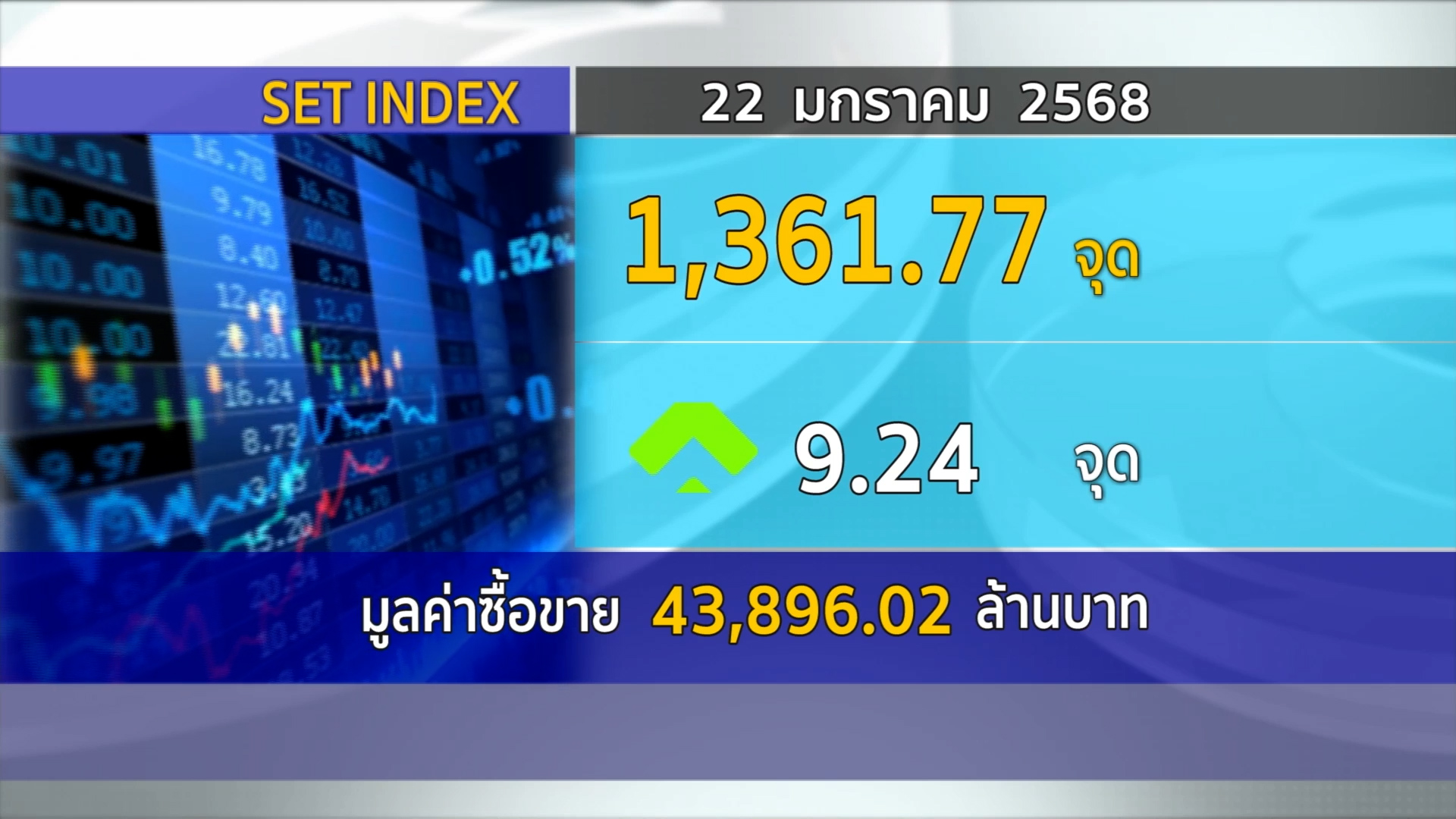SET ปิดวันนี้ที่ 1,361.77 จุด เพิ่มขึ้น 9.24 จุด (+0.68%) มูลค่าซื้อขาย 43,955.35 ล้านบาท นักวิเคราะห์ฯ ระบุตลาดหุ้นไทยวันนี้ดัชนีปรับตัวขึ้น ได้แรงหนุนจากกลุ่มธนาคารที่ปรับตัวขึ้น หลังการรายงานผลประกอบการออกมาดี และกลุ่มชิ้นส่วนอิเล็กทรอนิกส์ราคาปรับตัวขึ้นตามหุ้นเทคโนโลยีโลก หลังทรัมป์ ประกาศจะลงทุนโครงสร้างพื้นฐาน AI แนวโน้มวันพรุ่งนี้คาดดัชนีแกว่งไซด์เวย์ โดยติดตามรายละเอียดนโยบายทรัมป์เพิ่มเติม โดยให้กรอบแนวรับ 1,355 จุด และแนวต้าน 1,365 จุด .-สำนักข่าวไทย