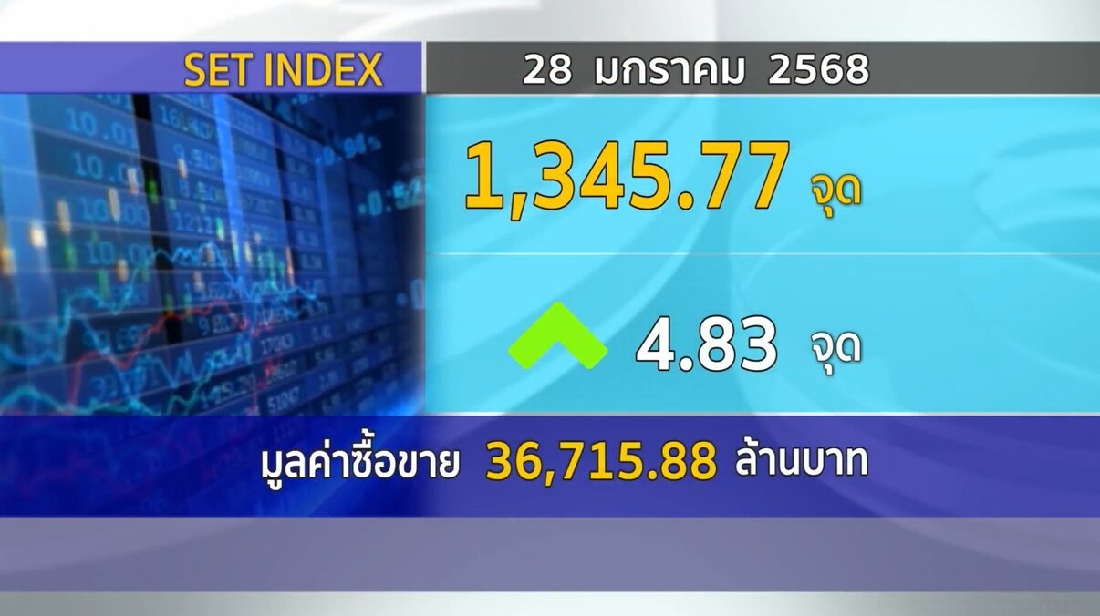 กทม. 28 ม.ค.-SET ปิดวันนี้ที่ 1,345.77 จุด เพิ่มขึ้น 4.83 จุด (+0.36%) มูลค่าซื้อขาย 36,715.88 ล้านบาท