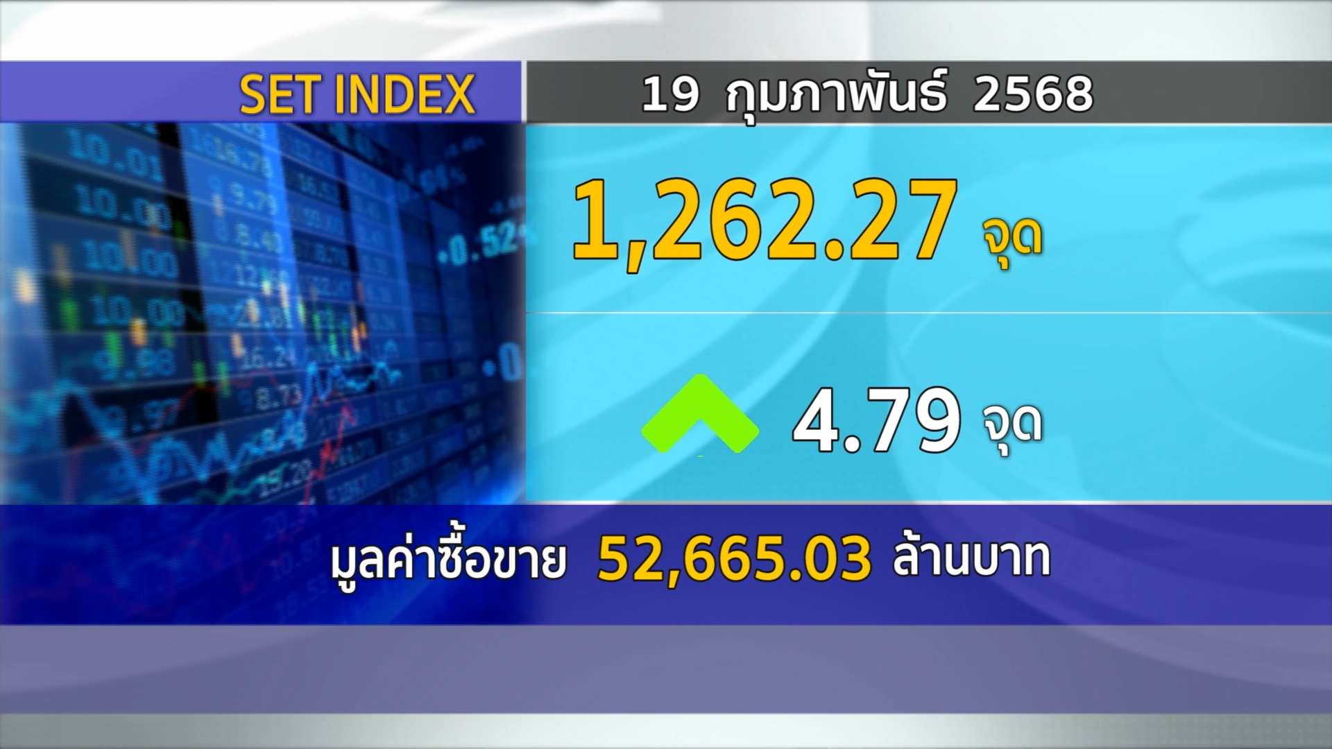 กทม. 19 ก.พ.- SET ปิดวันนี้ที่ 1,262.27 จุด เพิ่มขึ้น 4.79 จุด (+0.38%) มูลค่าซื้อขาย 52,617.62 ล้านบาท