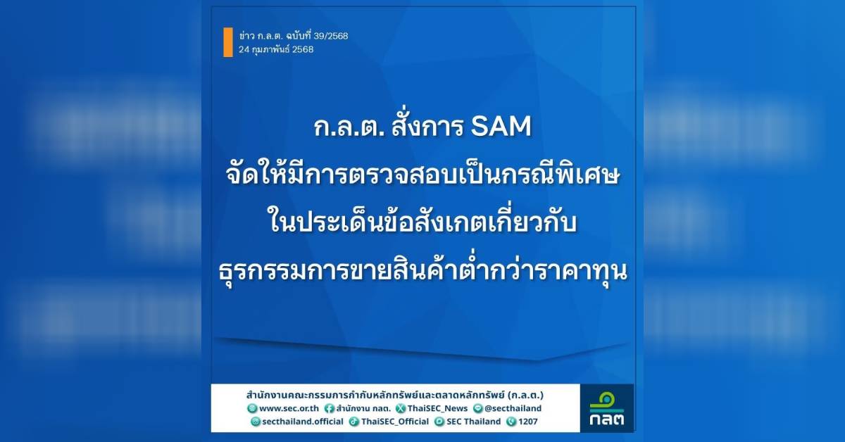 สำนักงานคณะกรรมการกำกับหลักทรัพย์และตลาดหลักทรัพย์ (ก.ล.ต.) ได้พิจารณาประกอบกับการเปิดเผยข้อมูลในงบการเงินของ SAM แล้ว จึงอาศัยอำนาจตามมาตรา 58(3) แห่งพระราชบัญญัติหลักทรัพย์และตลาดหลักทรัพย์ พ.ศ. 2535 สั่งการให้ SAM จัดให้มีการตรวจสอบเป็นกรณีพิเศษ (special audit) เกี่ยวกับการทำธุรกรรมดังกล่าวข้างต้น และดำเนินการโดยผู้สอบบัญชีที่อยู่ในบัญชีที่ ก.ล.ต. ให้ความเห็นชอบ และให้นำส่งรายงานผลการตรวจสอบกรณีพิเศษ รวมทั้งเอกสารและหลักฐานที่เกี่ยวข้องต่อ ก.ล.ต. ภายใน 30 วันนับแต่วันที่ 24 กุมภาพันธ์ 2568 พร้อมทั้งเปิดเผยรายงานผลการตรวจสอบกรณีพิเศษผ่านระบบเผยแพร่ข้อมูลบริษัทจดทะเบียนของตลาดหลักทรัพย์แห่งประเทศไทย (ระบบ SETLink) ด้วย.-516.-สำนักข่าวไทย