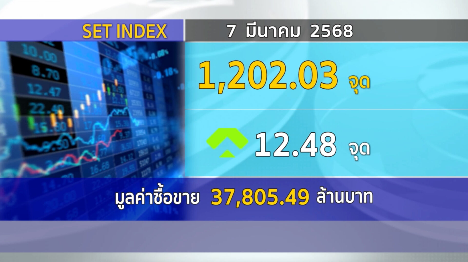 กทม. 7 มี.ค.- SET ปิดวันนี้ที่ 1,202.03 จุด เพิ่มขึ้น 12.48 จุด (+1.05%) มูลค่าการซื้อขาย 37,844.70 ล้านบาท