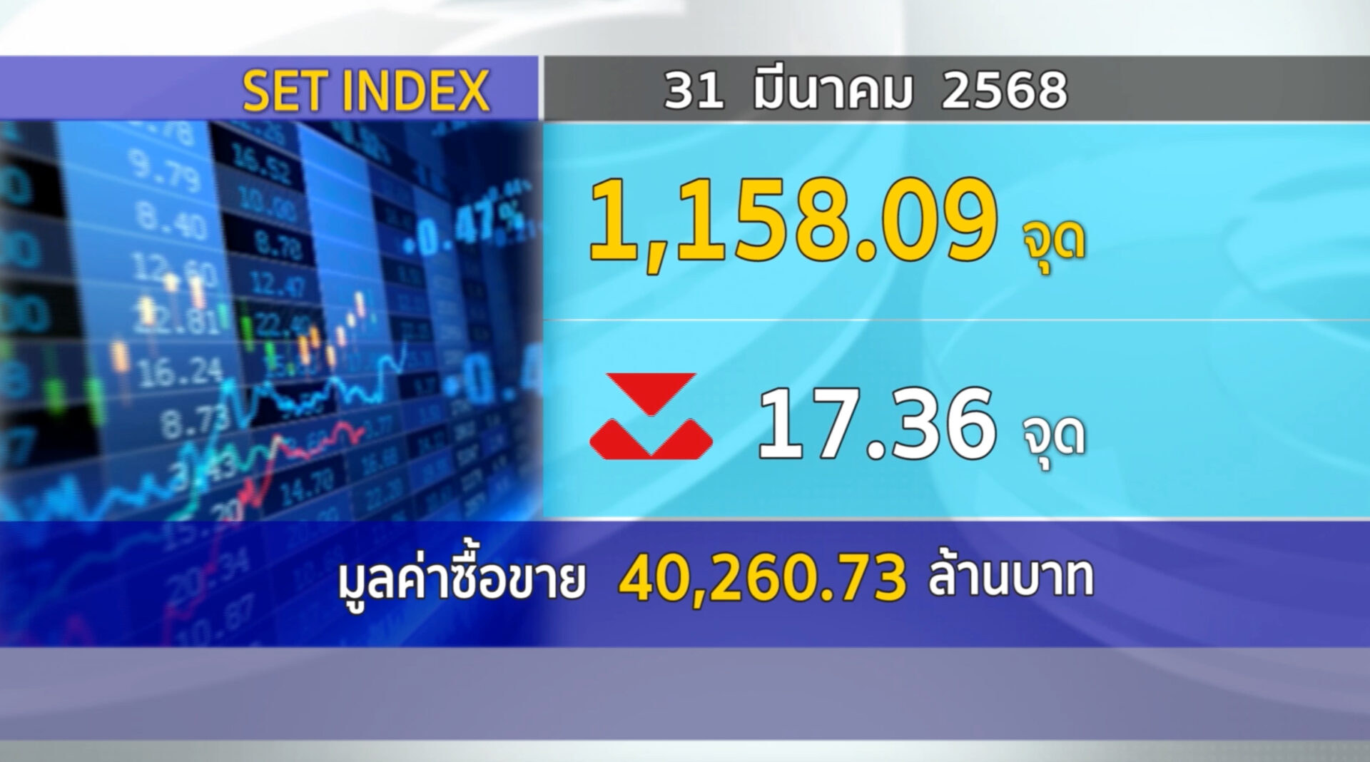 กทม. 31 มี.ค.- SET ปิดวันนี้ที่ 1,158.09 จุด ลดลง 17.36 จุด (-1.48%) มูลค่าซื้อขาย 40,260.73 ล้านบาท