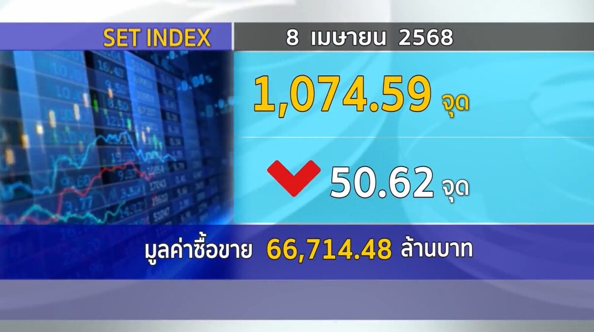 กทม. 8 เม.ย.-SET ปิดวันนี้ที่ 1,074.59 จุด ลดลง 50.62 จุด (-4.50%) มูลค่าการซื้อขาย 66,790.73 ล้านบาท
