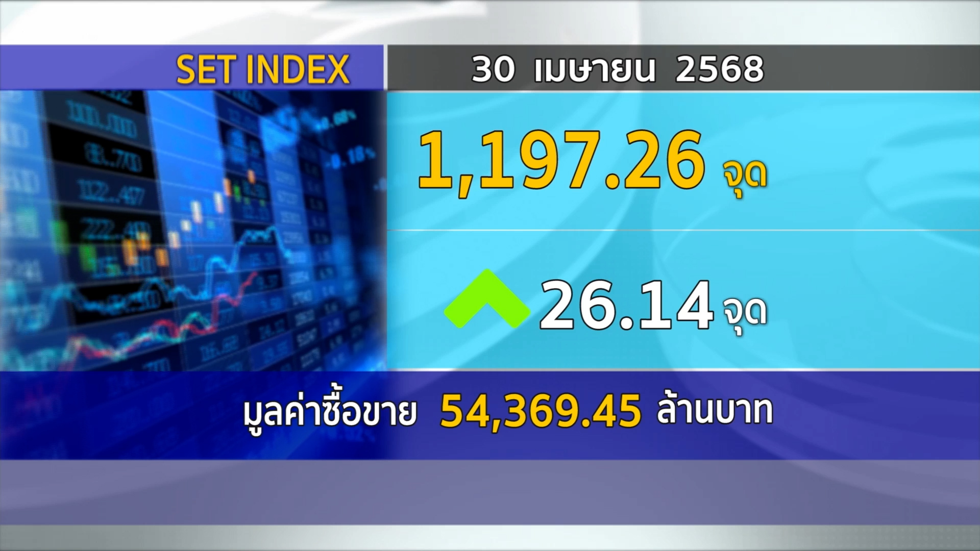 SET ปิดวันนี้ที่ 1,197.26 จุด เพิ่มขึ้น 26.14 จุด (+2.23%) มูลค่าซื้อขาย 54,394.52 ล้านบาท นักวิเคราะห์ฯ เผยตลาดหุ้นไทยวันนี้พุ่แรงรับ กนง.ลดดอกเบี้ยตามคาด แม้ปัจจัยต่างประเทศยังรอความชัดเจนการเจรจาการค้าระหว่างสหรัฐและประเทศต่างๆ แนวโน้มวันศุกร์ 2 พ.ค.คาดแกว่งไซด์เวย์รอปัจจัยใหม่ ให้แนวต้าน 1,200-1,210 จุด แนวรับ 1,170-1,180 จุด .-สำนักข่าวไทย