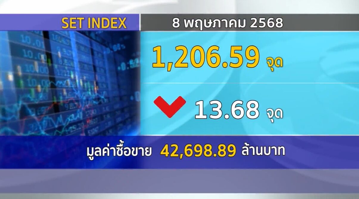 กทม. 8 พ.ค.-ตลาดหลักทรัพย์ฯ ปิดวันนี้ 1,206.59 จุด ลดลง 13.68 จุด (-1.12%) มูลค่าซื้อขาย 42,698.89 ล้านบาท