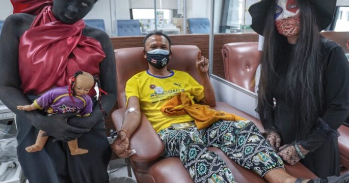 วันฮาโลวีน ศูนย์บริการโลหิตแห่งชาติสภากาชาดไทย ชวนคนไทยบริจาคเลือด เพื่อเพิ่มปริมาณคลังเลือด มีบริการแต่งกายแฟนซีชุดผีให้ถ่ายรูป พร้อมแจกโดนัทรูปผีแฟนซี ให้กับผู้มาบริจาค บรรยากาศในการบริจาคโลหิต ที่ศูนย์บริการโลหิตแห่งชาติ สภากาชาดไทย เนื่องในเทศกาลวันฮาโลวีน 31 ตุลาคม 2565 สนุกสนานไปด้วยธีมผีหลอกทั้งเจ้าหน้าที่ให้บริการแต่งกายด้วยชุดผีแม่นาค และแดรกคิวล่า เดินมาแวะเวียนทักทายผู้มาบริจาคโลหิต หรือแม้แต่พยาบาลก็คาดผม สวมหมวก สัญลักษณ์ เทศกาลวันฮาโลวีน เพื่อให้เข้ากับ โครงการ “ฮาโลวีน หนีผีมาให้เลือด”สร้างสีสัน และเพิ่มยอดการบริจาคโลหิต ซึ่งผู้บริจาคโลหิต ในวันนี้ (31 ต.ค.) จะได้รับชุดขนมโดนัทรูปผีแฟนซีกลับไปรับประทานด้วย นอกจากสุขภาพดีจากการบริจาคเลือดและยังอิ่มใจจากการทำบุญด้วยการบริจาคเลือดเพื่อช่วยเหลือเพื่อนมนุษย์ ทั้งนี้โลหิตที่ได้รับบริจาคนี้จะนำมาไปกระจายช่วยเหลือ ผู้ป่วยในสถานพยาบาลต่างๆโดยแต่ละวันทางศูนย์บริการโลหิตแห่งชาติสภากาชาดไทยต้องการโลหิต 2,200 ยูนิต แต่มีผู้บริจาคเฉลี่ยวันละ 500-600 ยูนิต ซึ่งจากการสอบถามผู้บริจาคโลหิตระบุว่าการเดินทางมาบริจาคในช่วงเทศกาลฮาโลวีนนี้ตรงกับรอบของการรับบริจาคที่ห่างกัน 3 เดือน การแต่งกายด้วยชุดผีให้บริการรับบริจาคโลหิตก็เป็นอีกส่วนหนึ่งที่สร้างสีสันกระตุ้นการบริจาคได้ดีส่วนตัวเห็นว่าการมาบริจาคเลือดดีกว่าการเที่ยวกลางคืน ในช่วงเทศกาลวันฮาโลวีน หรือบางคนก็มาบริจาคเนื่องในวันเกิด ภาพ ชำนาญวุฒิ สุขุมวานิช