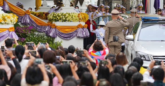 บรรยากาศหน้าพระบรมมหาราชวัง เต็มไปด้วยประชาชนที่มารอเฝ้าทูลละอองธุลีพระบาทรับเสด็จ ในโอกาสที่ พระบาทสมเด็จพระเจ้าอยู่หัว และสมเด็จพระนางเจ้า ฯ พระบรมราชินี เสด็จพระราชดำเนินไปทรงปฏิบัติพระราชกรณียกิจในพิธีเปลี่ยนเครื่องทรงจากฤดูฝนเป็นเครื่องทรงฤดูหนาวถวายแด่พระพุทธมหามณีรัตนปฏิมากร ในวันที่ 1 พฤศจิกายน 2563.ทรงพระกรุณาโปรดเกล้าโปรดกระหม่อม พระราชทาน พระบรมฉายาลักษณ์พระบาทสมเด็จพระบรมชนกาธิเบศร มหาภูมิพลอดุลยเดชมหาราช บรมนาถบพิตร พระบรมฉายาลักษณ์พระบาทสมเด็จพระเจ้าอยู่หัว ที่ฉายกับสมเด็จพระนางเจ้า ฯ พระบรมราชินี และน้ำพระพุทธมนต์ ซึ่งได้มาจากพระราชพิธีบรมราชาภิเษก พุทธศักราช 2562 พิธีเปลี่ยนเครื่องทรงพระพุทธมหามณีรัตนปฏิมากรทั้งสามฤดู และพิธีพุทธาภิเษกพระพุทธรูปสำคัญต่าง ๆ ที่ประกอบพิธี ณ พระอุโบสถวัดพระศรีรัตนศาสดาราม แก่ประชาชนที่มาเฝ้าทูลละอองธุลีพระบาทรับเสด็จ เพื่อความเป็นสิริมงคลในชีวิต.รวมทั้งให้หน่วยราชการในพระองค์เชิญอาหารพระราชทานและสิ่งของพระราชทาน ได้แก่ อาหารกลางวันและอาหารเย็น ของว่าง น้ำดื่ม เสื้อกันฝน สมุดไดอารี่ ไปมอบแก่ประชาชนที่มารอเฝ้าทูลละอองธุลีพระบาทภายในวัดพระศรีรัตนศาสดาราม ด้านหน้าพระบรมมหาราชวัง ตลอดเส้นทางถนนหน้าพระลานไปจนถึงถนนราชดำเนินใน ยังความปลื้มปีติและสำนึกในพระมหากรุณาธิคุณเป็นล้นพ้นอันหาที่สุดมิได้.ภาพถ่ายโดย ชำนาญวุฒิ สุขุมวานิช ทีมช่างภาพสำนักข่าวไทย อสมท