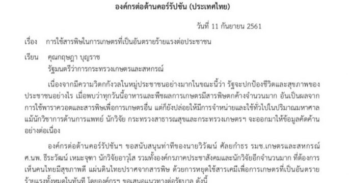 องค์กรต่อต้านคอร์รัปชั่นส่งจดหมายถึง รมว.เกษตรฯ ขอให้ยุติใช้สารเคมีอันตราย ด้าน รมว.เกษตรฯ สั่งกรมวิชาการเกษตรชี้แจงด่วน