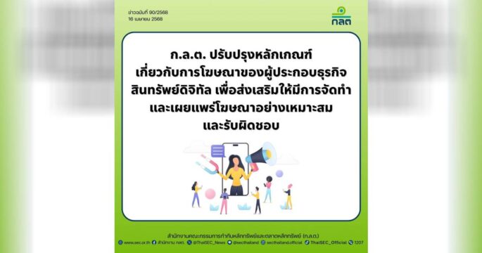ก.ล.ต. ปรับปรุงหลักเกณฑ์เกี่ยวกับการโฆษณาของผู้ประกอบธุรกิจสินทรัพย์ดิจิทัล เพื่อให้มีความเหมาะสม ยืดหยุ่น สอดคล้องกับทางปฏิบัติของผู้ประกอบธุรกิจสินทรัพย์ดิจิทัล และส่งเสริมมาตรฐานของอุตสาหกรรม รวมทั้งสนับสนุนให้เกิดการโฆษณาอย่างรับผิดชอบ มีผลใช้บังคับตั้งแต่ 16 เม.ย. 2568