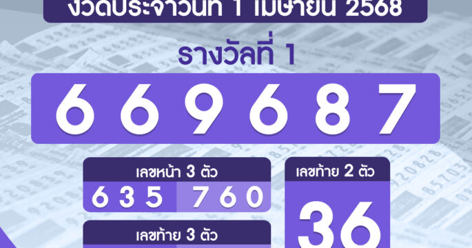 รางวัลที่ 1 ได้แก่ 669687รางวัลเลขหน้า 3 ตัว ได้แก่ 635, 760รางวัลเลขท้าย 3 ตัว ได้แก่ 180, 666รางวัลเลขท้าย 2 ตัว ได้แก่ 36