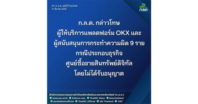 กรุงเทพ 21 มี.ค. – ก.ล.ต. กล่าวโทษ Aux Cayes FinTech Co. Ltd. ผู้ให้บริการแพลตฟอร์มบนเว็บไซต์ www.okx .com/th (OKX) และผู้สนับสนุนการกระทำความผิด 9 ราย ต่อ บก.ปอศ.กรณีกระทำการเข้าข่ายการประกอบธุรกิจศูนย์ซื้อขายสินทรัพย์ดิจิทัลโดยไม่ได้รับอนุญาต ตาม พ.ร.ก. สินทรัพย์ดิจิทัลฯ โดยมีบุคคลทั้ง 9 รายเป็นผู้สนับสนุนการกระทำของ OKX สำนักงานคณะกรรมการกำกับหลักทรัพย์และตลาดหลักทรัพย์ (ก.ล.ต.) ได้รับแจ้งเบาะแสและตรวจสอบ พบว่าตั้งแต่วันที่ 15 ตุลาคม 2564 OKX ได้ให้บริการจัดระบบการซื้อขายสินทรัพย์ดิจิทัล เพื่ออำนวยความสะดวกให้เกิดการซื้อขายแลกเปลี่ยนสินทรัพย์ดิจิทัล โดยเก็บค่าธรรมเนียมร้อยละ 0.1 ของมูลค่าธุรกรรมที่ลูกค้าซื้อขายสินทรัพย์ดิจิทัล และมีการชักชวนและประชาสัมพันธ์ให้มาใช้บริการผ่านเว็บไซต์ OKX รวมถึงยังมีกิจกรรมส่งเสริมการขายอันเป็นการชักชวน ผ่านช่องทางการสื่อสารต่าง ๆ เช่น Telegram ชื่อ “OKX TH” Twitter (ปัจจุบันเปลี่ยนชื่อเป็น X) ชื่อ “OKX […]