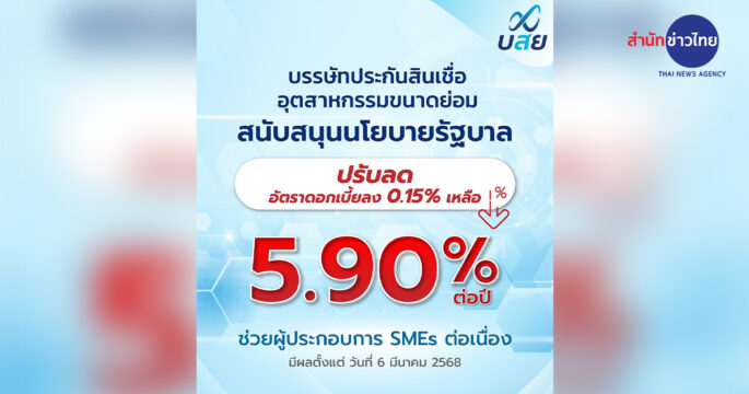 บสย. ปรับลดอัตราดอกเบี้ย Prime Rate ลง 0.15% เหลือ 5.90% ต่อปี สนับสนุนนโยบายรัฐบาล เดินหน้าช่วยเหลือ SMEs ต่อเนื่อง