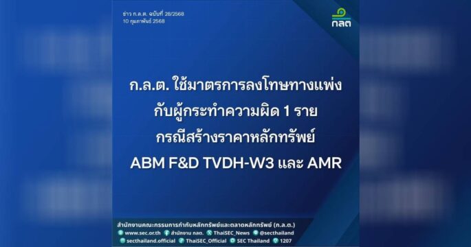 ก.ล.ต. ใช้มาตรการลงโทษทางแพ่งกับ “พชรดนัย ชาญหัตถกิจ” กรณีสร้างราคา 4 หลักทรัพย์ ได้แก่ ABM F&D TVDH-W3 และ AMR ปรับกว่า 4.6 ล้านบาท ห้ามเป็นกรรมการหรือผู้บริหาร 48 เดือน