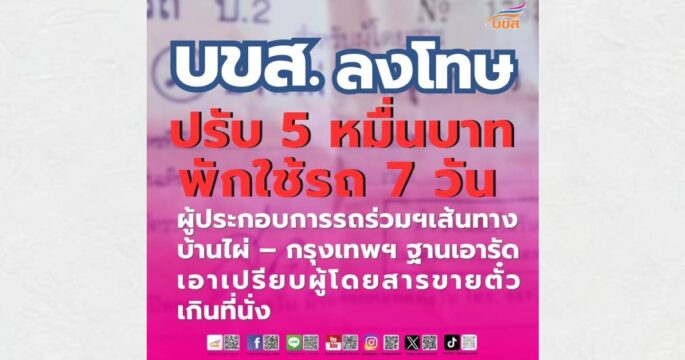 “บขส.” ลงโทษผู้ประกอบการรถร่วมฯ ขายตั๋วที่บ้านไผ่ เกินที่นั่ง ปรับ 50,000 บาท พักใช้รถ 7 วัน ระบุเอารัดเอาเปรียบผู้โดยสาร-ไม่คำนึงถึงความปลอดภัยในชีวิตและทรัพย์สิน