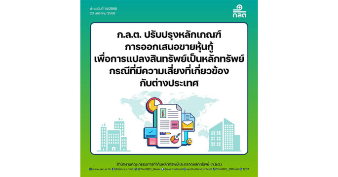 กรุงเทพฯ 20 ม.ค.- ก.ล.ต.ปรับปรุงหลักเกณฑ์การออกเสนอขายหุ้นกู้เพื่อการแปลงสินทรัพย์เป็นหลักทรัพย์ (Securitized Bond) กรณีที่มีความเสี่ยงที่เกี่ยวข้องกับต่างประเทศ โดยมีผลใช้บังคับตั้งแต่ 16 ม.ค. 2568 สำนักงานคณะกรรมการกำกับหลักทรัพย์และตลาดหลักทรัพย์ (ก.ล.ต.) ปรับปรุงหลักเกณฑ์การออกเสนอขายหุ้นกู้เพื่อการแปลงสินทรัพย์เป็นหลักทรัพย์ กรณีที่มีความเสี่ยงที่เกี่ยวข้องกับต่างประเทศ ได้แก่ กรณีที่สินทรัพย์ซึ่งจะโอนมายังนิติบุคคลเฉพาะกิจเป็นสิทธิเรียกร้องที่เกิดขึ้นในต่างประเทศ และกรณีที่ผู้มีสิทธิเสนอโครงการเป็นกิจการต่างประเทศ เพื่อให้สอดคล้องกับหลักเกณฑ์การออกเสนอขายตราสารหนี้อื่นที่มีความเสี่ยงของต่างประเทศ โดยกำหนดให้การออกเสนอขายต้อง (1) ได้รับการจัดอันดับความน่าเชื่อถือของตราสารไม่ต่ำกว่าระดับที่สามารถลงทุนได้ โดยสถาบันจัดอันดับความน่าเชื่อถือที่จัดตั้งขึ้นตามกฎหมายต่างประเทศ เว้นแต่เป็นการเสนอขายในลักษณะ PP10 (2) มีผู้แทนผู้ถือหุ้นกู้ และ (3) นำตราสารหนี้ที่เสนอขายไปขึ้นทะเบียนกับสมาคมตลาดตราสารหนี้ไทย นอกจากนี้ ยังปรับปรุงขอบเขตการจัดอันดับความน่าเชื่อถือของสถาบันจัดอันดับความน่าเชื่อถือที่จัดตั้งขึ้นตามกฎหมายต่างประเทศ ให้รองรับการจัดอันดับความน่าเชื่อถือของการเสนอขาย Securitized Bond ที่มีความเสี่ยงที่เกี่ยวข้องกับต่างประเทศ ทั้งนี้ ประกาศปรับปรุงหลักเกณฑ์ดังกล่าว*** ได้เผยแพร่ลงในราชกิจจานุเบกษาและมีผลใช้บังคับตั้งแต่วันที่ 16 มกราคม 2568 เป็นต้นไป.-516-สำนักข่าวไทย