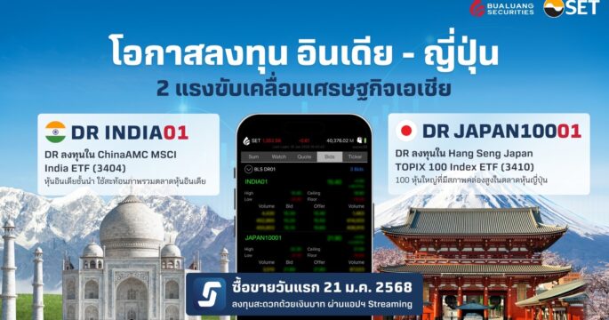 กรุงเทพฯ 20 ม.ค.- ตลาดหลักทรัพย์ฯ รับจดทะเบียน DR “INDIA01” และ “JAPAN10001” ออกโดย บล. บัวหลวง อ้างอิงกองทุน ETF ที่จดทะเบียนอยู่ในตลาดหลักทรัพย์ฮ่องกง เริ่มซื้อขาย 21 ม.ค. นี้ ตลาดหลักทรัพย์ฯ รับจดทะเบียน DR ใหม่ 2 หลักทรัพย์ ได้แก่ “INDIA01” และ “JAPAN10001” ออกโดยบริษัทหลักทรัพย์ บัวหลวง จำกัด (มหาชน) โดย DR “INDIA01” อ้างอิงกองทุน ChinaAMC MSCI India ETF ที่ลงทุนในหุ้นอินเดียขนาดใหญ่และขนาดกลางตามดัชนี MSCI India Net Total Return (USD)และ DR “JAPAN10001” อ้างอิงกองทุน Hang Seng Japan TOPIX 100 […]