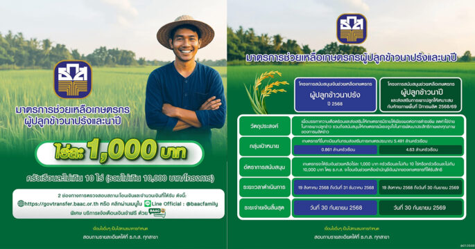 กรุงเทพฯ 1 ก.ย.-ธ.ก.ส. เดินหน้าช่วยเหลือเกษตรกรผู้ปลูกข้าวนาปรัง-นาปี กว่า 4.63 ล้านครัวเรือน ได้แก่ โครงการสนับสนุนช่วยเหลือเกษตรกรผู้ปลูกข้าวนาปรัง ปี 2568 โครงการสนับสนุนช่วยเหลือเกษตรกรผู้ปลูกข้าวนาปีและส่งเสริมการเพาะปลูกให้เหมาะกับศักยภาพพื้นที่ ปีการผลิต 2568/69 กรอบวงเงินรวมกว่า 5 หมื่นล้านบาท โดยสนับสนุนเงินช่วยเหลือไร่ละ 1,000 บาท ครัวเรือนละไม่เกิน 10 ไร่ รวมสูงสุดไม่เกิน 10,000 บาท โอนเงินรอบแรกตั้งแต่วันนี้เป็นต้นไป วงเงินรวมกว่า 2 หมื่นล้านบาท เกษตรกรผู้รับประโยชน์กว่า 2.48 ล้านราย พร้อมจัดมาตรการรักษาเสถียรภาพราคาข้าวเปลือก ปีการผลิต 2568/69 ได้แก่ สินเชื่อชะลอการขายข้าวเปลือกนาปี โดยรัฐบาลชำระดอกเบี้ยแทนเกษตรกรและสถาบันเกษตรกร พร้อมสนับสนุนค่าฝากเก็บและรักษาคุณภาพข้าวเปลือกอีก 1,500 บาทต่อตัน และสินเชื่อเพื่อรวบรวมข้าวและสร้างมูลค่าเพิ่มโดยสถาบันเกษตรกร ปีการผลิต 2568/69 สถาบันฯ ชำระดอกเบี้ยร้อยละ 1 ต่อปี ส่วนที่เหลือรัฐบาลและ ธ.ก.ส. รับชำระดอกเบี้ยแทน ตั้งเป้ารองรับปริมาณข้าวเปลือกรวม 4.5 ล้านตัน […]