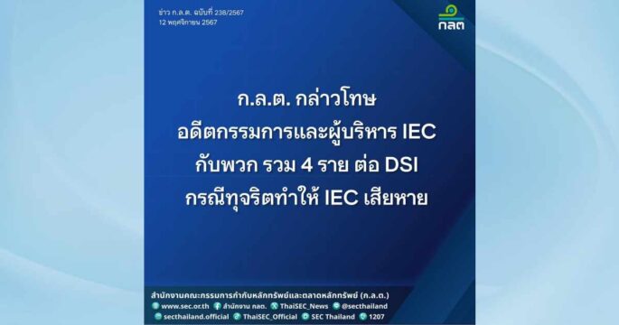 ก.ล.ต. กล่าวโทษอดีตกรรมการและผู้บริหาร บมจ.อินเตอร์แนชั่นเนิล เอนจีเนียริง (IEC) กับพวกรวม 4 ราย ต่อ DSI ฐานร่วมกันทุจริต ผ่านการลงทุนก่อสร้างโรงไฟฟ้าพลังงานขยะชีวมวลและ Plastic Recycling จ.ชลบุรี เพื่อแสวงหาประโยชน์ที่มิควรได้แก่ตนเองหรือผู้อื่น ทำให้ IEC ได้รับความเสียหาย