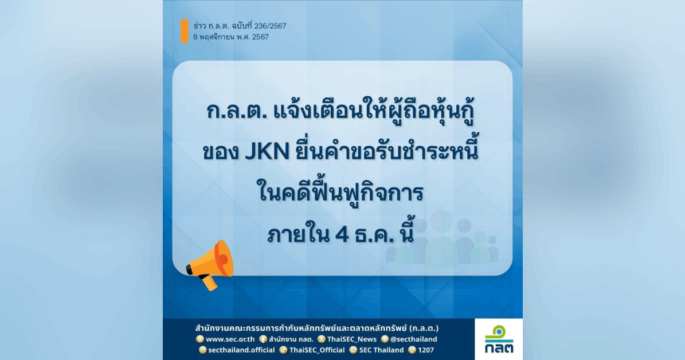กรุงเทพฯ 8 พ.ย. – ก.ล.ต. แจ้งเตือนให้ผู้ถือหุ้นกู้ของJKN ยื่นคำขอรับชำระหนี้ในคดีฟื้นฟูกิจการทางอิเล็กทรอนิกส์หรือยื่นด้วยตนเอง หรือมอบอำนาจด้วยแบบฟอร์มของกรมบังคับคดีต่อเจ้าพนักงานพิทักษ์ทรัพย์ กรมบังคับคดี หรือสำนักงานบังคับคดีทั่วประเทศ ภายใน 4 ธ.ค.2567 ตามที่ศาลล้มละลายกลางมีคำสั่งเมื่อวันที่ 23 เมษายน 2567 ให้บริษัท เจเคเอ็น โกลบอล กรุ๊ป จำกัด (มหาชน) หรือ JKN ฟื้นฟูกิจการและได้ตั้ง JKN เป็นผู้ทำแผน เมื่อวันที่ 29 สิงหาคม 2567 ซึ่งขั้นตอนต่อไปตามพระราชบัญญัติล้มละลาย พุทธศักราช 2483 กำหนดให้เจ้าหนี้ยื่นคำขอรับชำระหนี้ต่อเจ้าพนักงานพิทักษ์ทรัพย์ กรมบังคับคดี ภายในกำหนดเวลา 1 เดือน นับแต่วันที่ลงโฆษณาในราชกิจจานุเบกษา เมื่อวันที่ 4 พฤศจิกายน 2567 ซึ่งจะครบกำหนดในวันที่ 4 ธันวาคม 2567 นี้ ทั้งนี้ เพื่อไม่ให้ผู้ถือหุ้นกู้เสียสิทธิที่จะได้รับชำระหนี้คืน สำนักงานคณะกรรมการกำกับหลักทรัพย์และตลาดหลักทรัพย์ (ก.ล.ต.) จึงขอแจ้งเตือนให้ผู้ถือหุ้นกู้ […]