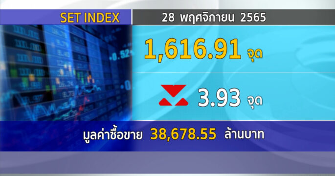ตลาดหุ้นไทย ปิดวันนี้ที่ 1,616.91 จุด ลดลง 3.93 จุด (-0.24%) มูลค่าการซื้อขาย 38,679.18 ล้านบาท