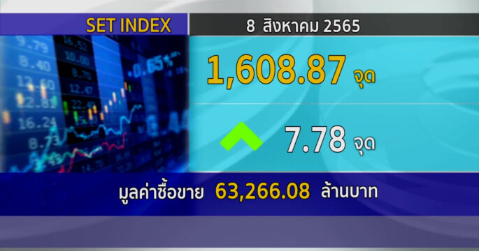 ตลาดหลักทรัพย์ ปิดวันนี้ที่ระดับ 1,608.87 จุด เพิ่มขึ้น 7.78 จุด (+0.49%) มูลค่าการซื้อขายราว 63,266.08 ล้านบาท