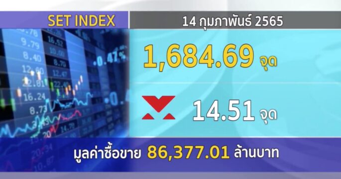 ตลาดหลักทรัพย์ ปิดวันนี้ที่ระดับ 1,684.69 จุด ลดลง 14.51 จุด (-0.85%) มูลค่าการซื้อขาย 86,377.01 ล้านบาท หุ้นไทยวันนี้ปรับลงตามตลาดหุ้นต่างประเทศ ตอบรับสถานการณ์ความตึงเครียดรัสเซีย-ยูเครน ยังไม่ชัดเจน และมีการปล่อยข่าวออกมาต่อเนื่องสร้าง
