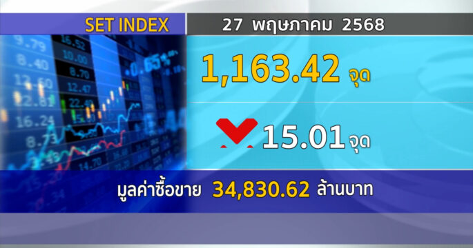 กทม. 27 พ.ค.- ตลาดหลักทรัพย์ฯ ปิดวันนี้ที่ 1,163.42 จุด ลดลง -15.01 จุด (-1.27%) มูลค่าซื้อขาย 34,845.62 ล้านบาท SET ปิดวันนี้ที่ 1,163.42 จุด ลดลง -15.01 จุด (-1.27%) มูลค่าซื้อขาย 34,845.62 ล้านบาท นักวิเคราะห์ฯ เผยตลาดหุ้นไทยวันนี้ลงไปแรง สภาพเศรษฐกิจซบเซายังกดดัน แนวโน้มการเจรจาการค้าไทย-สหรัฐน่าเป็นห่วงหลัง “ทรัมป์” กลับลำมาตรการภาษี EU ไป-มา อีกทั้งความขัดแย้งการเมืองในประเทศสร้างความกังวลเพิ่มเติม แนวโน้มวันพรุ่งนี้แนะติดตามการพิจารณาร่าง กม.งบประมาณปี 69 และการประชุมเฟด ให้แนวต้าน 1,180 จุด แนวรับ 1,160-1,150 จุด .-สำนักข่าวไทย