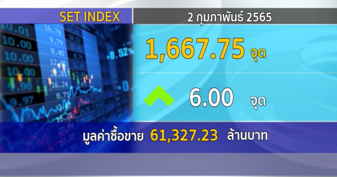 ตลาดหลักทรัพย์ ปิดวันนี้ที่ระดับ 1,667.75 จุด เพิ่มขึ้น 6.00 จุด (+0.36%) มูลค่าการซื้อขาย 61,327.23 ล้านบาท หุ้นไทยวันนี้ปรับเพิ่มขึ้นต่อเนื่อง เป็นไปตามทิศทางตลาดหุ้นต่างประเทศ และตลาดหุ้นภูมิภาคเอเชีย