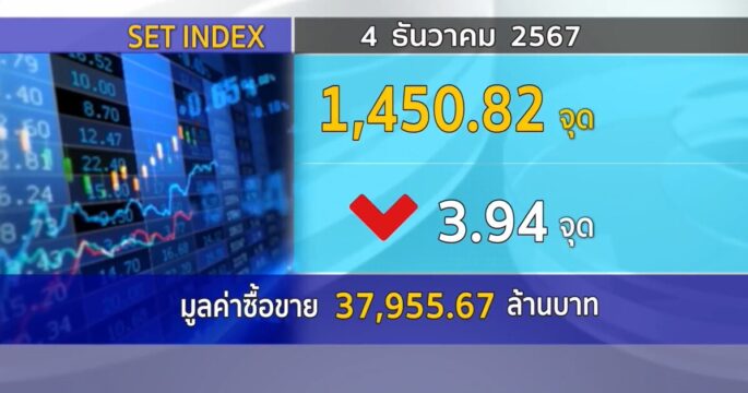 SET ปิดวันนี้ที่ 1,450.82 จุด ลดลง 3.94 จุด (-0.27%) มูลค่าการซื้อขาย 37,955.67 ล้านบาท