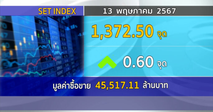 กทม. 21 พ.ค.- ตลาดหลักทรัพย์ฯ ปิดช่วงเช้าวันนี้ 1,371.07 จุด ลดลง 7.63 จุด (-0.55%) มูลค่าซื้อขายราว 20,281 ล้านบาท การซื้อขายช่วงเช้าดัชนีปรับตัวลงตามภูมิภาค ทำระดับสูงสุด 1,376.94 จุด และต่ำสุด 1,369.21 จุด .-สำนักข่าวไทย