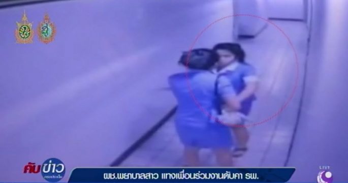 วงจรปิดจับชัด สาวผู้ช่วยพยาบาล รพ.ดังย่านห้วยขวาง เลือดเดือด ชักมีดหมายไล่แทงเพื่อนร่วมงานคู่กรณี เพื่อนอีกคนเห็นท่าไม่ดี ผวาเข้าขวาง เจอแทงดับ คู่กรณีก็ถูกแทงเจ็บ เหตุหึงหวง