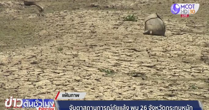จับตาสถานการณ์ภัยแล้ง พบกรณีฉุกเฉินภัยแล้ง ทั้งหมด 26 จังหวัด แบ่งเป็นภาคเหนือ 7 จังหวัดฯ, ภาคอีสาน 10 จังหวัด, ภาคกลางและตะวันออก 8 จังหวัด และภาคใต้ 1 จังหวัด