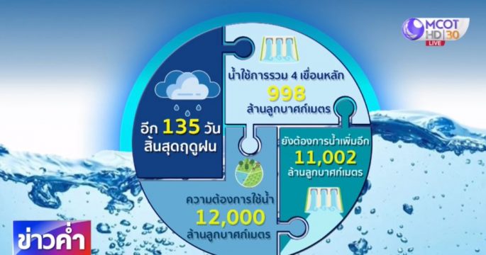 สสน. เผยอีก 135 วัน จะสิ้นสุดฤดูฝน ปริมาณน้ำใช้การของ 4 เขื่อนหลักลุ่มน้ำเจ้าพระยา มีน้ำใช้การได้รวม 998 ล้าน ลบ.ม. ขณะที่ตลอดทั้งปีประมาณการความต้องการใช้น้ำ อยู่ที่ 12,000 ล้าน ลบ.ม. เร่งเก็บกักน้ำเพิ่ม