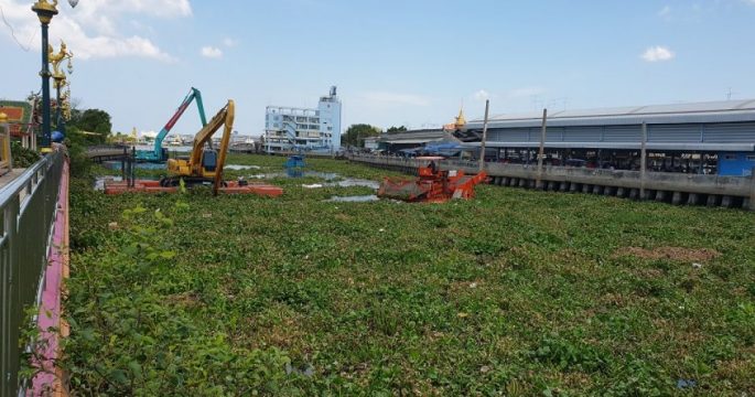 Concerned officials are now using heavy trucks to remove a large amount of water hyacinths which have blocked water draining in Mahachai Canal in Samut Sakhon.