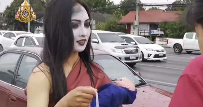 Passers-by were shocked for seeing well-known Thai female ghost Mae Nak selling sticks of roast pork at Wat Phra Yat