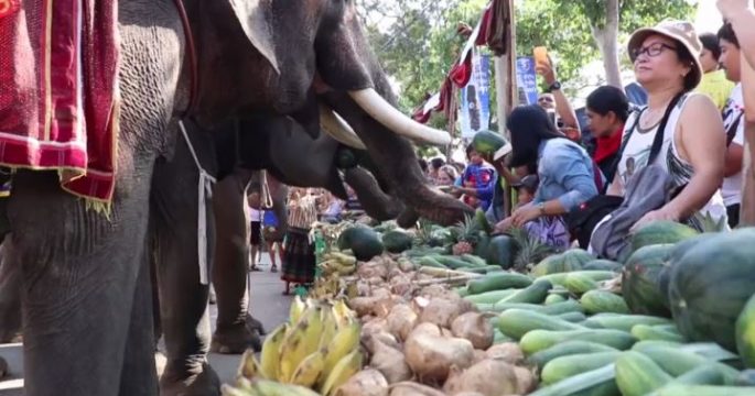 Nearly 200 elephants share a banquet of fruits in what is said to be the world’s largest elephant buffet during the annual Surin Elephant Round-Up in Thailand