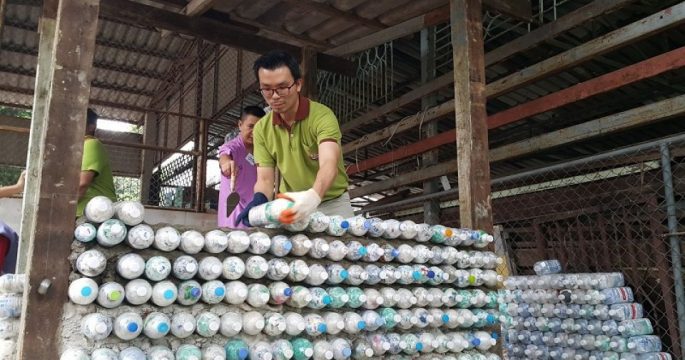 Nan hospital and local environment network has used recycled plastic bags and bottles to build toilet walls with help from the army engineers.