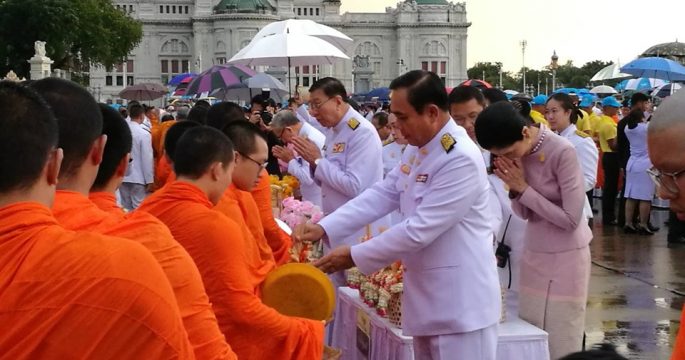 Prime Minister Prayut Chan-o-cha, cabinet ministers, armed forces chiefs gave alms to 570 Buddhist monks to mark the Chulalongkorn Memorial Day.